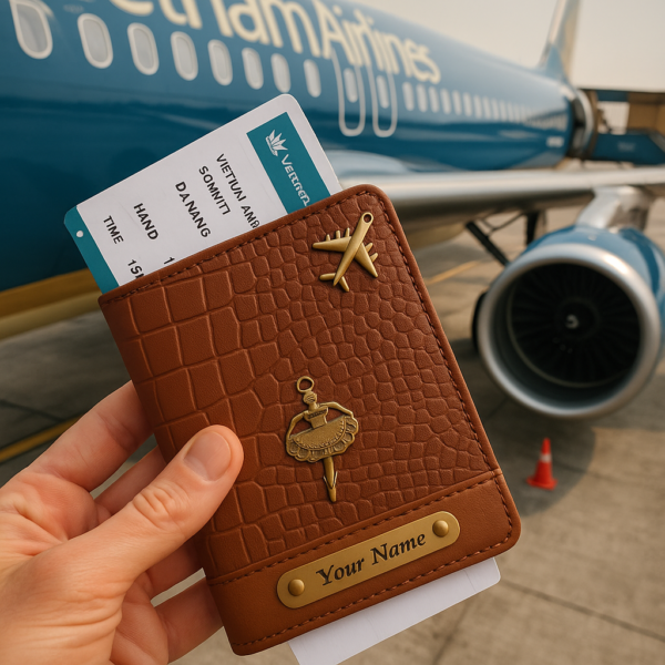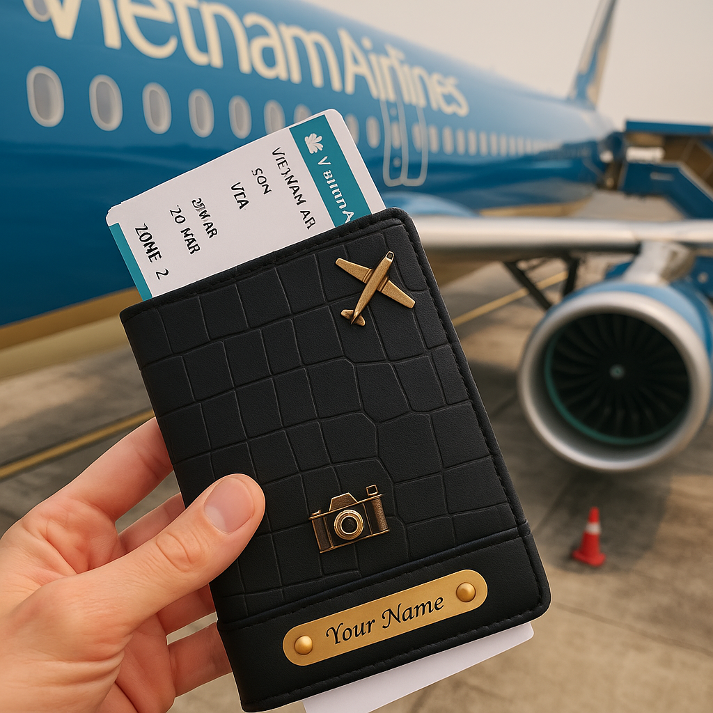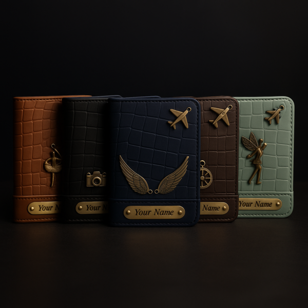 Elevate your travel documents with this sophisticated personalized passport cover. Crafted from premium black leather featuring an elegant crocodile pattern texture, this cover combines style with functionality. The distinctive gold-tone embellishments, including an aircraft and camera motif, add a touch of luxury and wanderlust appeal. The customizable nameplate allows you to make it uniquely yours, perfect for the discerning traveler. The interior provides dedicated slots for organized storage of your passport and travel essentials. The meticulous stitching and durable construction ensure your important documents remain protected throughout your journeys. Whether you’re a frequent flyer or occasional traveler, this passport cover makes a thoughtful gift or personal accessory that combines practicality with refined aesthetics. The classic black color and timeless design complement any travel ensemble while maintaining a professional appearance.